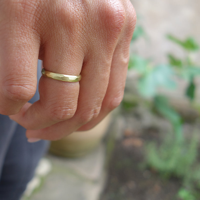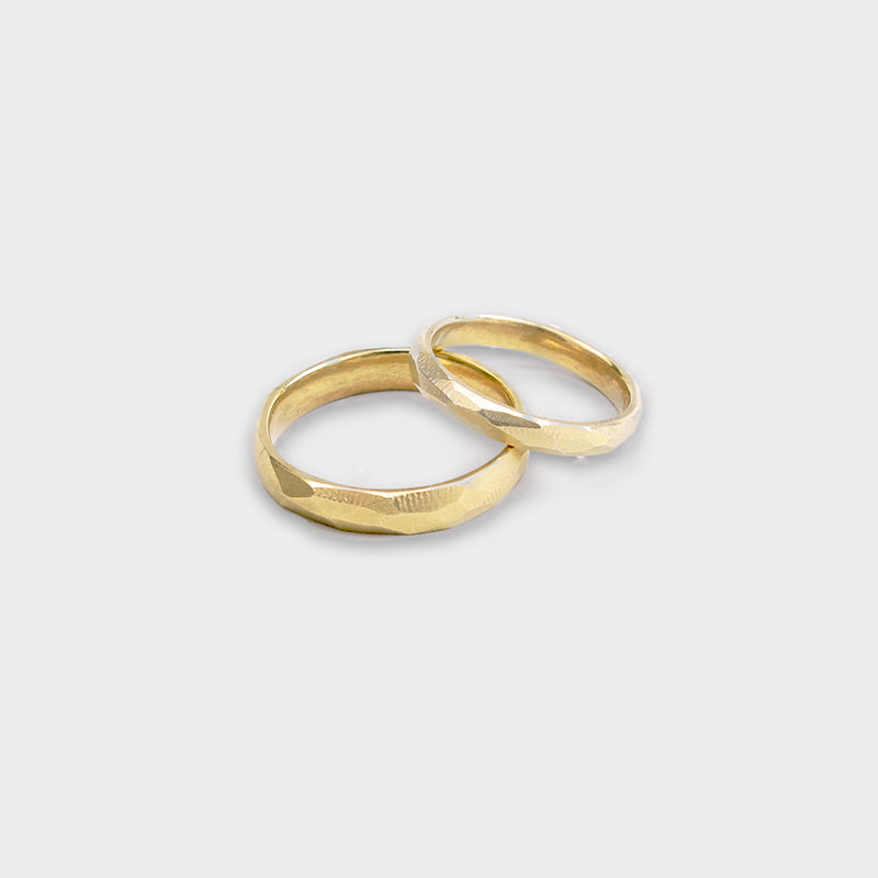 Unsere Nerio Trauringe aus hochwertigem 750 er Gelbgold zeigen in ihrem Design, wie sie gemacht wurden. Bei genauem Hinschauen sind sogar vereinzelt Feilstriche noch erkennbar. Jeder Ring enthält so seinen ganz persönlichen Fingerabdruck. Das Zusammenspiel der Flächen wirkt geometrisch und modern.